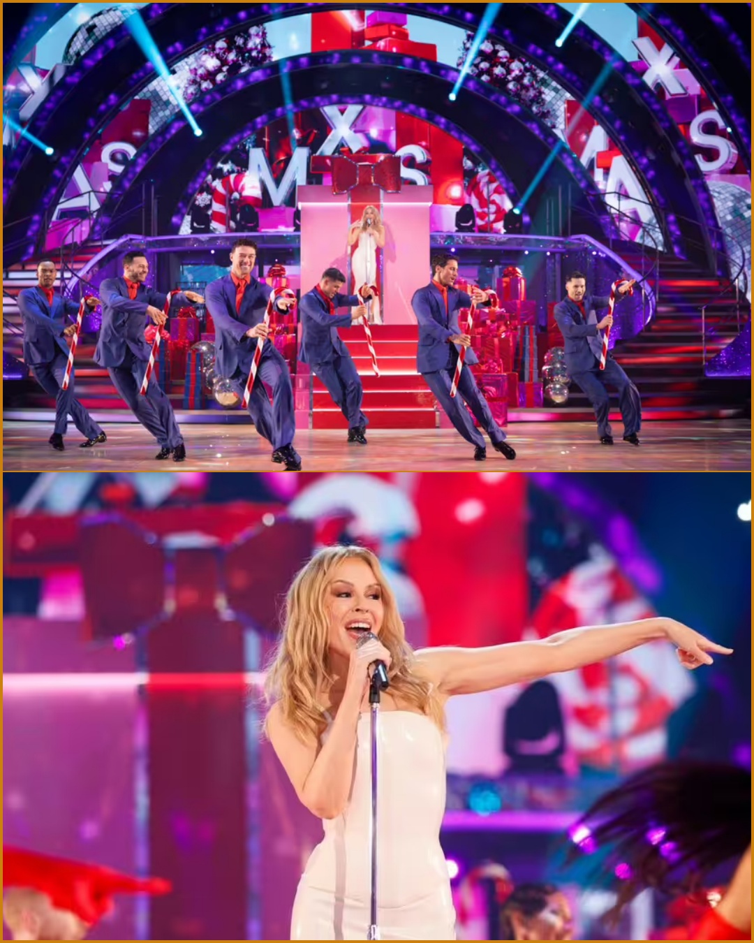 Kylie Minogue sings wheil the Strictly professionals dance around her