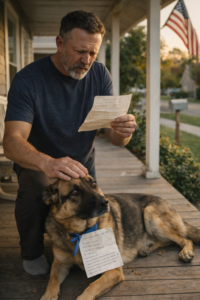 Just my skinny German Shepherd, ribs faintly showing under his dusty coat, breathing slow like he’d spent the weekend recovering from some private war, with a folded piece of paper tied to his collar using blue ribbon.