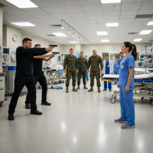At the far end of the ER, someone shouted for a trauma kit. Two corpsmen rolled in a Marine with a dislocated shoulder from a training accident, his face pale under desert-tan freckles. Another recruit sat with an ice pack pressed to his eyebrow, insisting he had not fallen off the obstacle course so much as “aggressively dismounted.” A sailor with a fishhook through his thumb stared at it with insulted disbelief.