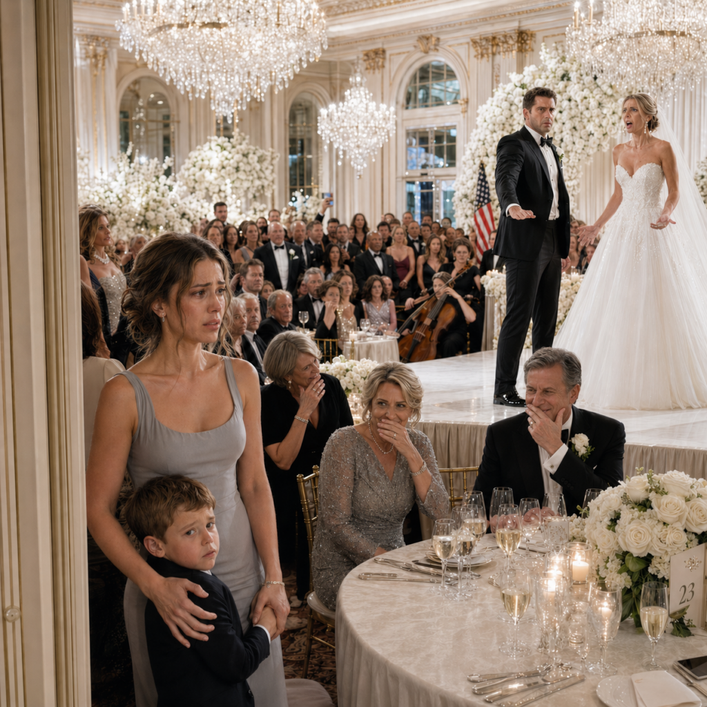 Two hundred people laughing under crystal chandeliers while I stood at the back of the ballroom in a dove-gray dress I had bought on clearance, holding my five-year-old son’s hand.